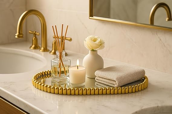 🖤 Uma bandeja decorativa dourada como essa da Amazon é perfeita para perfumes ou objetos no banheiro ou quarto.